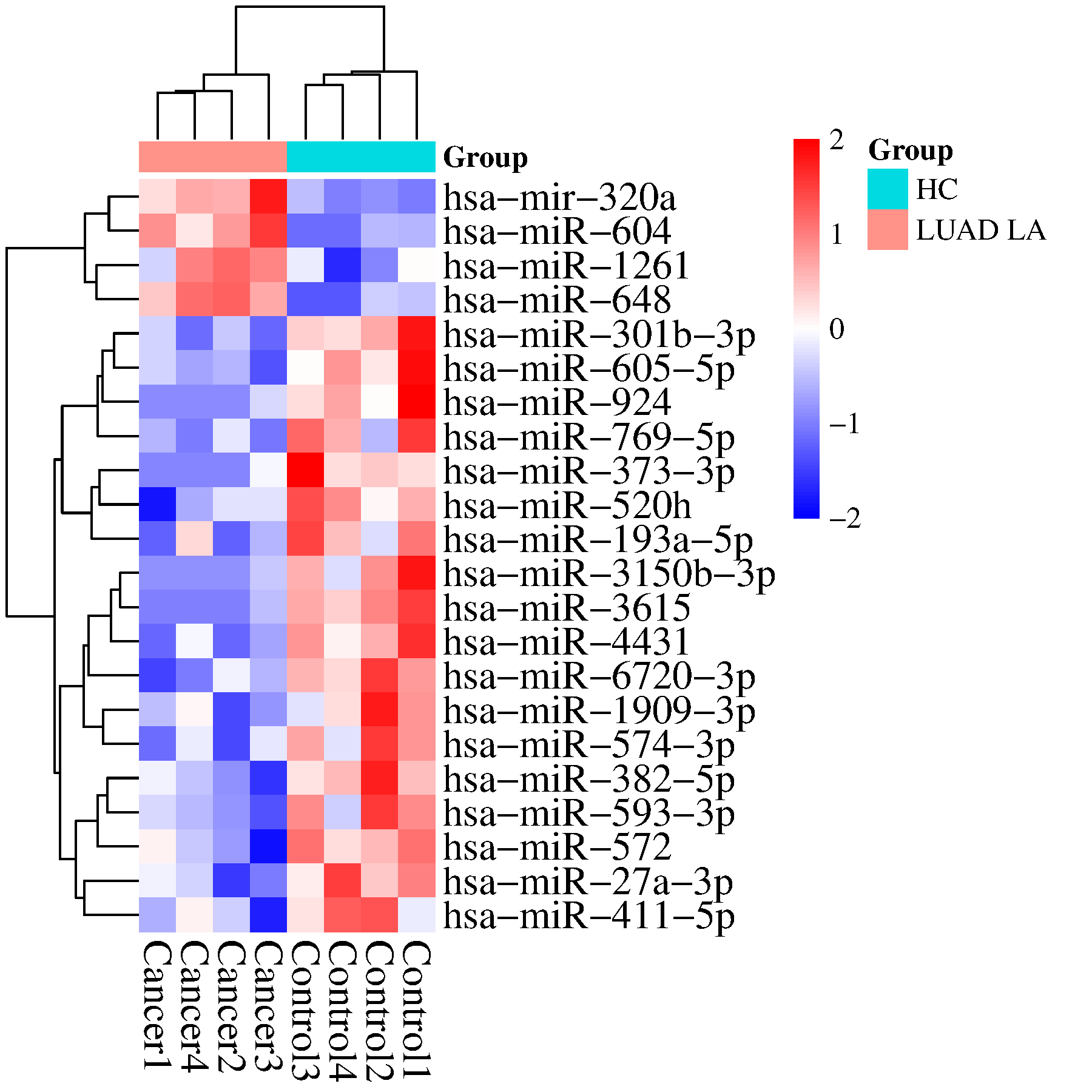This study used an exploratory observational design, involving eight subject including 4 for healthy control and 4 for locally advanced adenocarcinoma patients for exomiRs profiling. Respondents were recruited through purposive sampling using inclusion criteria such as newly diagnosed cases of primary lung adenocarcinoma and treatment-naïve at the time of diagnosis. Patients with a history of chemotherapy, radiotherapy, targeted therapy, immunotherapy, or surgical resection prior to sample collection were excluded to minimize treatment-related confounding effects on exomiRs expression.