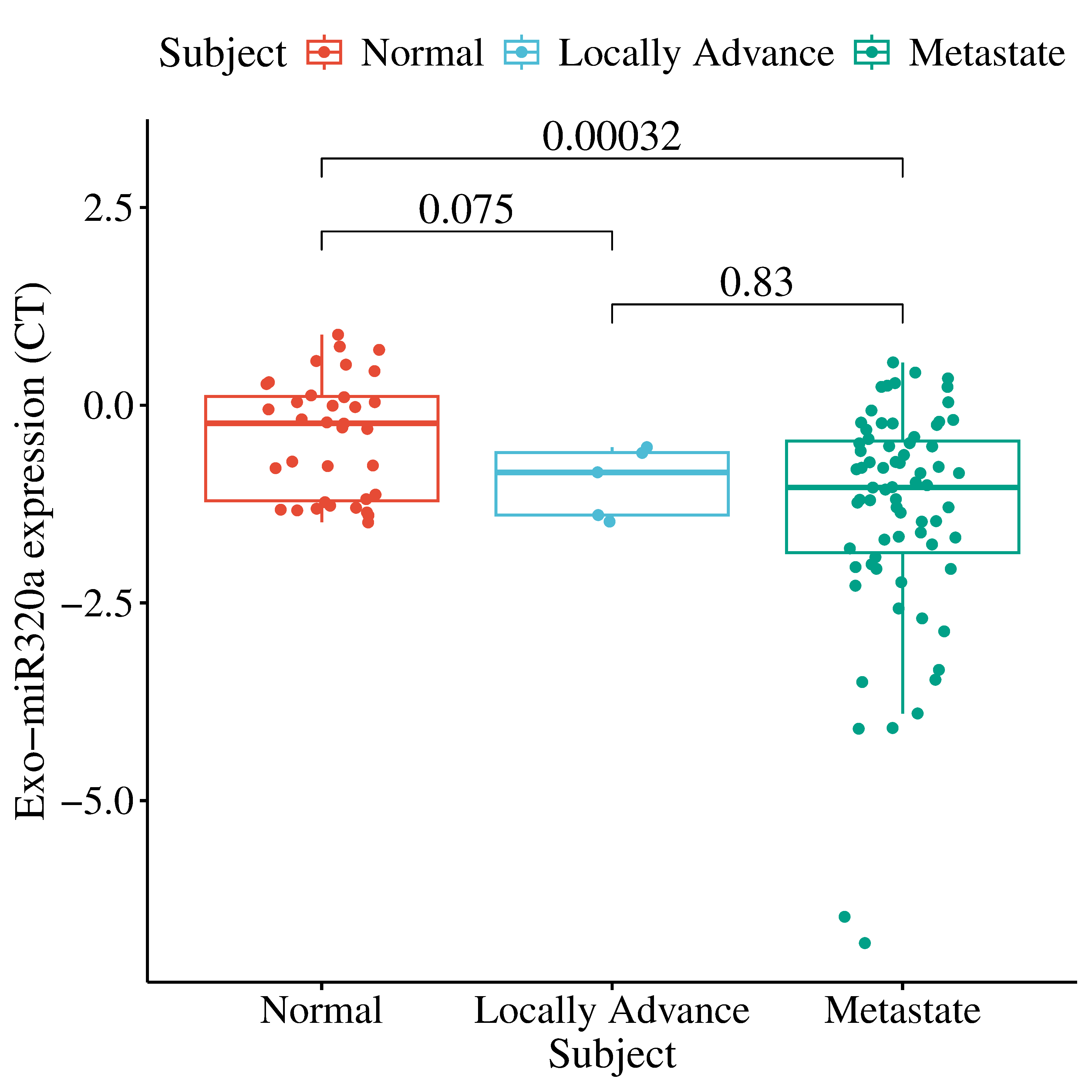 The cycle threshold (Ct) values for exomiR-320a and exomiR-103a-3p were analyzed for data homogeneity. Homogeneity of Ct values for exomiR-320a was assessed using Levene’s test, while normality was evaluated using the Kolmogorov-Smirnov test. Differential expression of exomiR-320a Ct values among the 3 groups healthy controls, locally advanced lung adenocarcinoma, and metastatic lung adenocarcinoma was analyzed using the Kruskal-Wallis test, followed by the Wilcoxon test for pairwise comparisons. The expression of exomiR-320a was calculated using the Livak method to determine whether there was an increase or decrease in expression in adenocarcinoma compared to healthy controls. To evaluate the diagnostic performance of exomiR-320a, Receiver Operating Characteristic (ROC) curve analysis was performed by plotting sensitivity against 1-specificity using ΔCt values. The Area Under the Curve (AUC) was calculated along with its 95% confidence interval (CI). The AUC was calculated by entering the ΔCt value of miR-320a in the lung adenocarcinoma group compared to healthy controls.