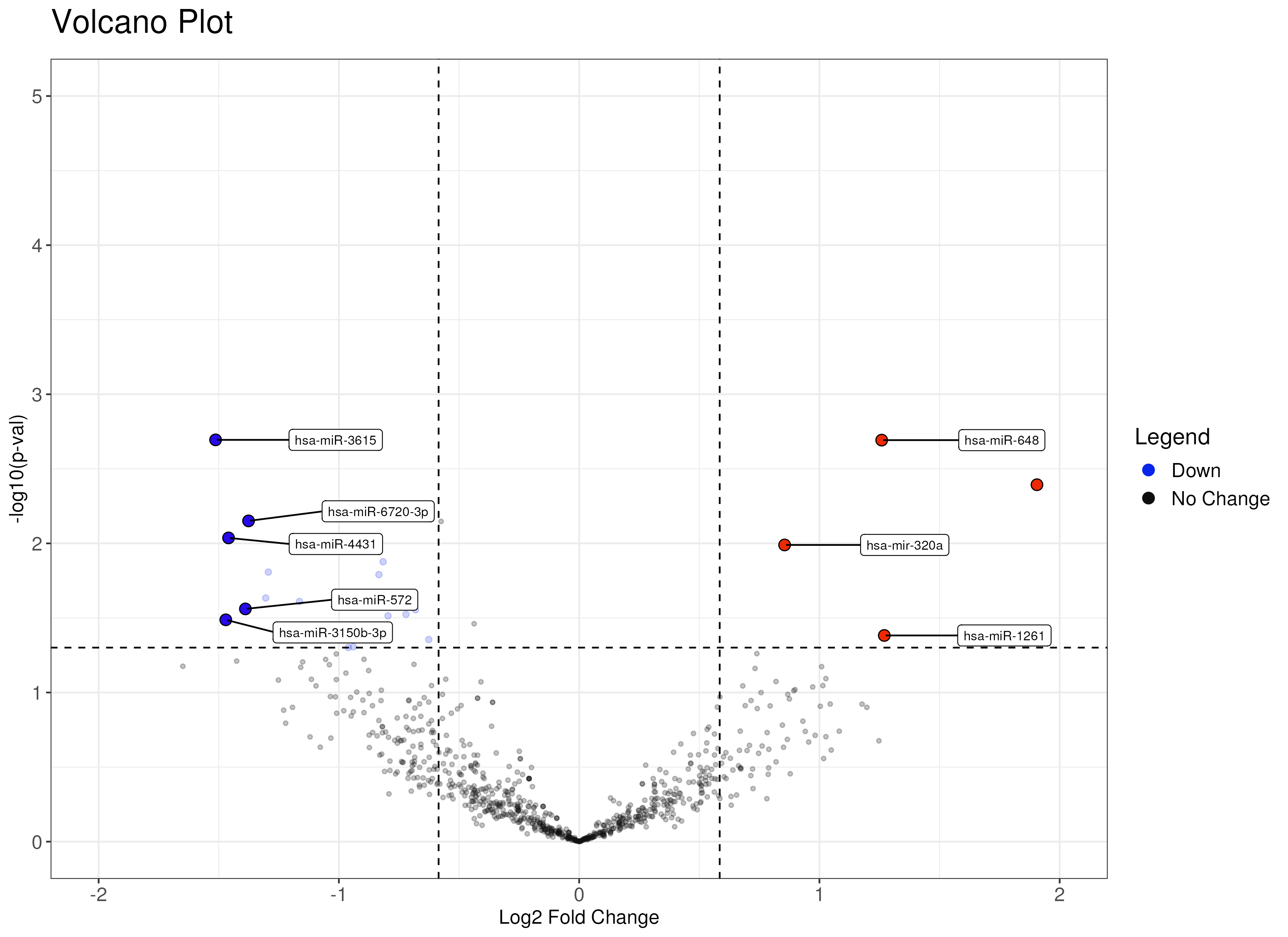 Eight RNA samples, consisting of 4 locally advanced lung adenocarcinoma samples and 4 healthy control samples, were processed using the nCounter miRNA Expression Panel V3B. The panel uses nanostring technology to perform expression profiling through direct quantification of individual RNA molecules. The nCounter miRNA Expression Panel analyzes up to 827 human miRNAs. RNA samples underwent quality control for RNA concentration and purity, Field of View, Binding density, positive control linearity, fM detection threshold, and normalization factor [31,32].