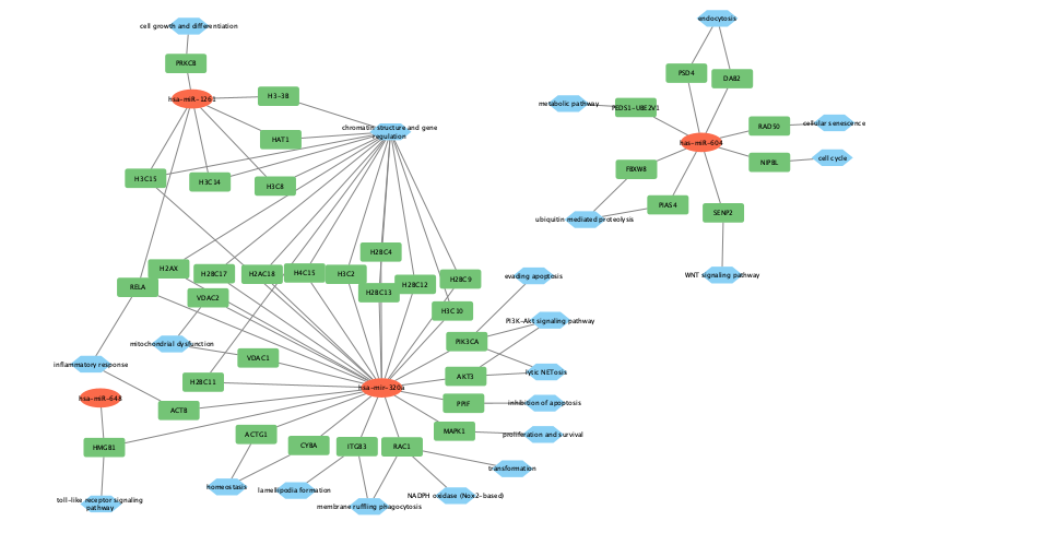 The hsa-miR-320a encoding gene is located on chromosome 8, short arm region 2, band 1, sub-band 3. The role of miR-320a as an oncogene is evident from several studies on cancer. Hsa-miR-320a has been identified as the optimal upstream miRNA regulator of CISD2. MiR-320a inhibits CISD2 expression by directly binding to the 3’UTR region, resulting in a negative correlation between the 2. MiR-320a, as a negative regulator of CDGSH iron-sulfur domain 2 (CISD2), participates in bone metastasis of lung adenocarcinoma via MYC activation and is associated with tumor infiltration into the immune system [78]. Hsa-miR-320 overexpression is associated with invasion and metastasis in ovarian cancer. miR-320a promotes epithelial ovarian cancer (EOC) cell proliferation and invasion by targeting RASSF8. The expression level of miR-320a in EOC specimens was found to be associated with ovarian cancer progression and infiltration. MiR-320a significantly promotes proliferation, migration, and invasion in EOC cells [79].
