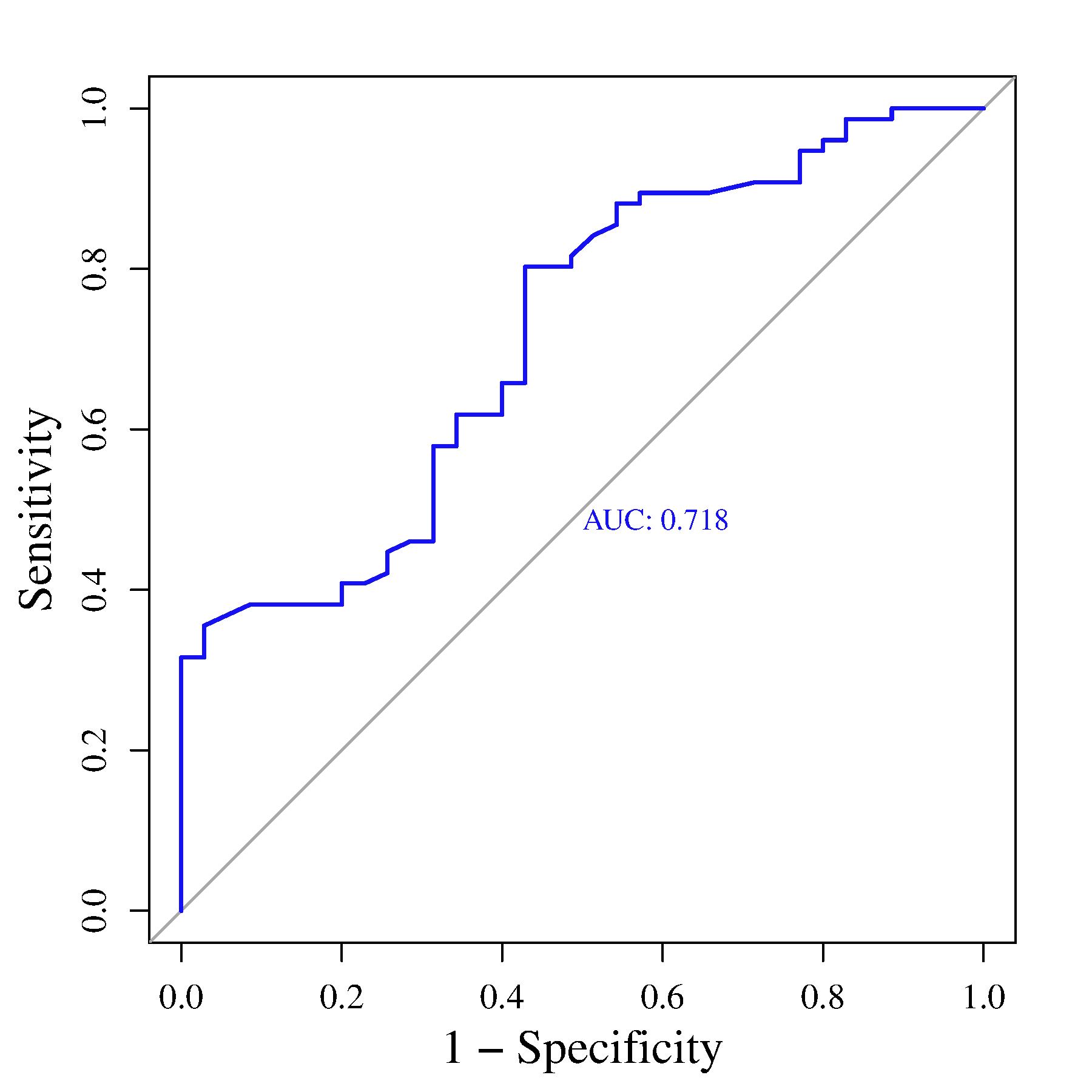 Receiver operating characteristic (ROC) curve analysis of ΔCt data from patients with lung adenocarcinoma compared to healthy controls yielded an AUC value of 0.718 (Figure 8). This value is interpreted as moderate [77], so exomiR-320a can be considered as a diagnostic biomarker but must be combined with other exomiR biomarkers. ExomiR-320a have moderate discriminatory power to distinguish lung adenocarcinoma patients from healthy controls. While this suggests potential clinical utility, it is unlikely that exomiR-320a alone would be sufficient as a stand-alone diagnostic marker in routine practice. Instead, its translational relevance may lie in being part of a biomarker panel that integrates multiple circulating miRNAs or combines exomiRs signatures with established diagnostic tools such as imaging and protein-based assays. Such multi marker approaches have been reported to substantially improve both sensitivity and specificity, thereby increasing clinical applicability. ExomiRs obtained from liquid biopsies are important to develop because they are minimally invasive and compatible with qRT-PCR platforms that are already widely available in clinical laboratories, supporting the feasibility of future clinical implementation. Further large-scale validation studies are warranted to confirm these findings and optimize the diagnostic model before translation into practice.