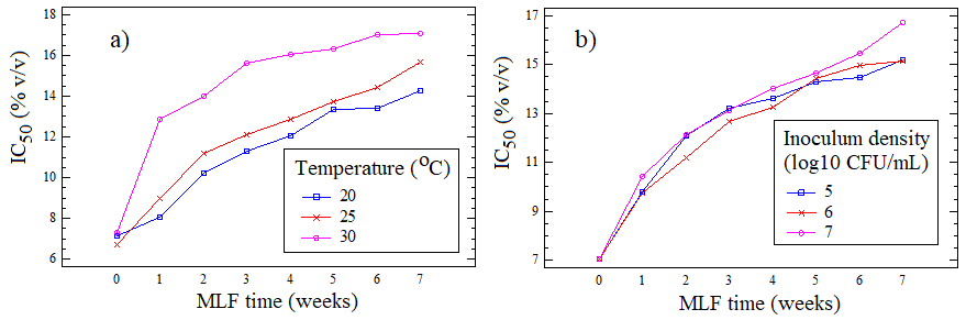 Figure 6 Antioxidant activity (IC 50 ) at different temperature levels (a) and Lactobacillus plantarum density (b) during malolactic fermentation.