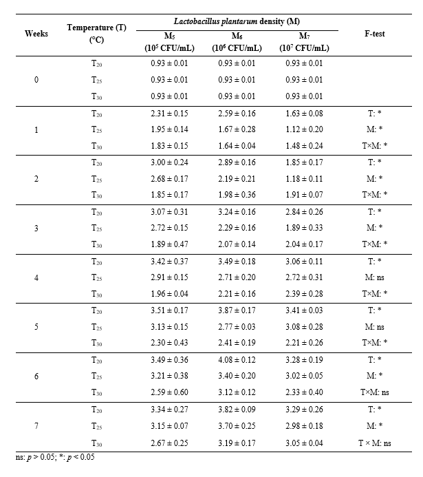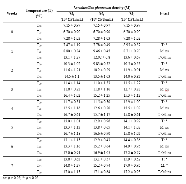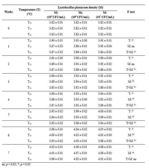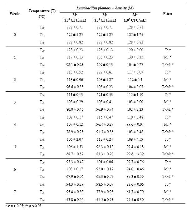 During malolactic fermentation, pH of red dragon fruit wine increased gradually in all treatments ( Table 1 ). The results showed that the increasing pH significantly depended on both incubation temperature and Lactobacillus plantarum density. Figure 1 shown the temperatures of 20 - 25 °C combined with higher inoculum levels (10 6 - 10 7 CFU/mL) produced a faster and more pronounced pH rise than treatments at 30 °C and/or with a lower inoculum (10 5 CFU/mL). This pattern is consistent with the temperature window (approximately 22 - 27 °C) over which lactic acid bacteria generally exhibit optimal growth, enzyme activity, and malate decarboxylation rates [18] .