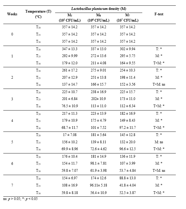 Similarly, malic acid concentrations also declined at all 3 inoculation density levels (10 5 , 10 6 and 10 7 CFU/mL). At the week 7, the concentration of malic acid in the treatment inoculated with Lactobacillus plantarum at 10 6 CFU/mL was 0.19 g/L, significantly lower than in treatments with 10 5 and 10 7 CFU/mL (0.24 - 0.25 g/L). Acording to Balmaseda et al. [9] , the efficiency of malolactic fermentation process depends on environmental conditions, such as temperature and ethanol concentration. Excessively high bacteria Lactobacillus plantarum density can impose mutual inhibition, intensify nutrient competition, or microbial imbalance, thereby reduced malic acid conversion efficiency [29] . A residual malic acid concentration below 0.30 g/L is considered an indicator of the completion of malolactic fermentation in conventional winemaking process [31] . The present study demonstrated that all treatments achieved this threshold, confirming successful MLF. However, the combination of fermentation at 20 °C and inoculation with Lactobacillus plantarum of 10 6 CFU/mL showed a clear advantage in malic acid conversion (0.16 g/L), indicating that this condition represents the most efficient malolactic fermentation process in red dragon fruit wine.