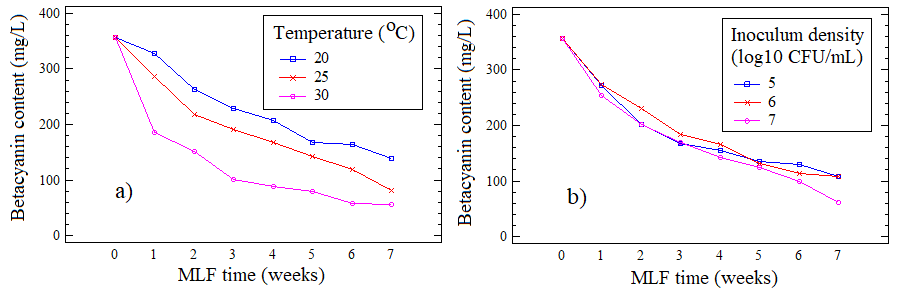 Betacyanin concentrations declined continuously during malolactic fermentation process, indicating that progressive pigment degradation in the presence of Lactobacillus plantarum ( Figure 5(a) ). The reduction of betacyanin concentrations occurred during the first 3 weeks, then after which the concentrations tended to stabilize. It reflects simutaneous and strong growth of Lactobacillus plantarum combine with active malate conversion, thereby undermining pigment stability due to disrupt the betalain chromophorse under ethanol-rich medium [41] . At 30 °C, betacyanin concentrations declined sharply from the first week, indicating a negative effect of high temperature on pigment stability in the fermentation medium. Betacyanins are betalain pigments with a thermolabile chromophoric ring, so higher temperature can promote molecular degradation via deglycosylation and disruption of the the chromophore [42] . By contrast, betacyanin losses were lower across the treatments at 20 °C because of slow thermal degradation and limits unwanted oxidative reactions [43] . After 7 weeks, betacyanin concentrations ranged from 154 ± 6.97 to 88.8 ± 13.0 mg/L at 20 °C depending on inoculum level but dropped to 108 ± 16.9 to 41.8 ± 4.04 mg/L at 25 °C and to only 59.8 ± 8.18 to 52.5 ± 3.87 mg/L at 30 °C, confirming the high dominant effect of temperature.