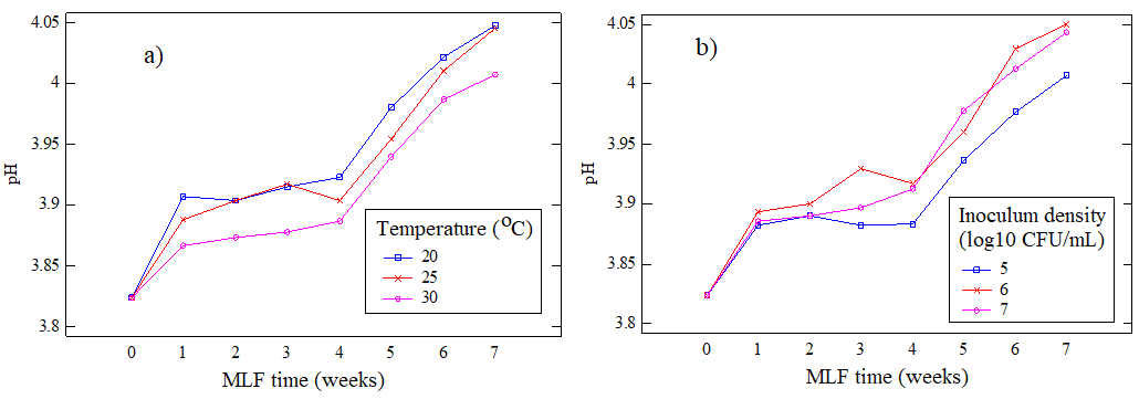 Temperature plays as a decisive environmental driver of malolactic fermentation performance. After 7 weeks (Figure 1a), pH of wines fermented at 20 - 25 °C varied of 4.05, significantly higher than the treatment fermented at 30 °C (pH = 4.01), indicating a direct temperature effect on the rate and efficiency of malic-to-lactic conversion. However, the absolute difference was negligible (0.04 units) and is unlikely to hold biological or technological relevance in the context of wine fermentation. Therefore, while statistical analysis confirms a difference, the practical impact on fermentation performance or product quality is likely limited. At 20 °C, Lactobacillus plantarum maintained stable growth and likely supported robust malolactic decarboxylase activity, thereby facilitating malic acid depletion and the accompanying pH increase [19] . In contrast, fermentation at 30 °C yielded a lower final pH, plausibly because elevated temperature can sensitize Lactobacillus plantarum to inhibitory metabolites or oxidative stress, disrupting or incompletely executing MLF [20] . The warmer condition may also permit undesirable microorganisms to proliferate and produce additional organic acids, further depressing pH [21,22] .
