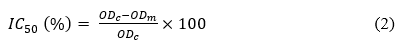 where ODm and ODc are the absorbance values of the sample and control, respectively. IC 50 (concentration required to scavenge 50% of DPPH radicals) was determined from linear regression of scavenging activity (%) against concentration. Lower IC 50 values indicated stronger antioxidant activity.