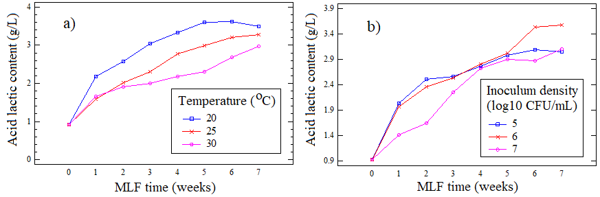 In conventional winemaking, lactic acid is an important factor to modulate wine acidity and thereby the acid-base status, microbial stability, and sensory attributes [32] . In this study, lactic acid accumulation was governed by both fermentation condition and time during malolactic fermentation ( Table 3 ). Generally, combining temperature and bacterial inoculation showed a progressive increase in lactic acid at all stages of malolactic fermentation process.