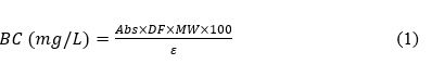 where BC = total betacyanin (mg/L), Abs = absorbance at 537 nm, DF = dilution factor, MW = molecular weight of betacyanin (550 g/mol), and ε = molar absorptivity of betacyanin in water (6,000 L/mol cm).