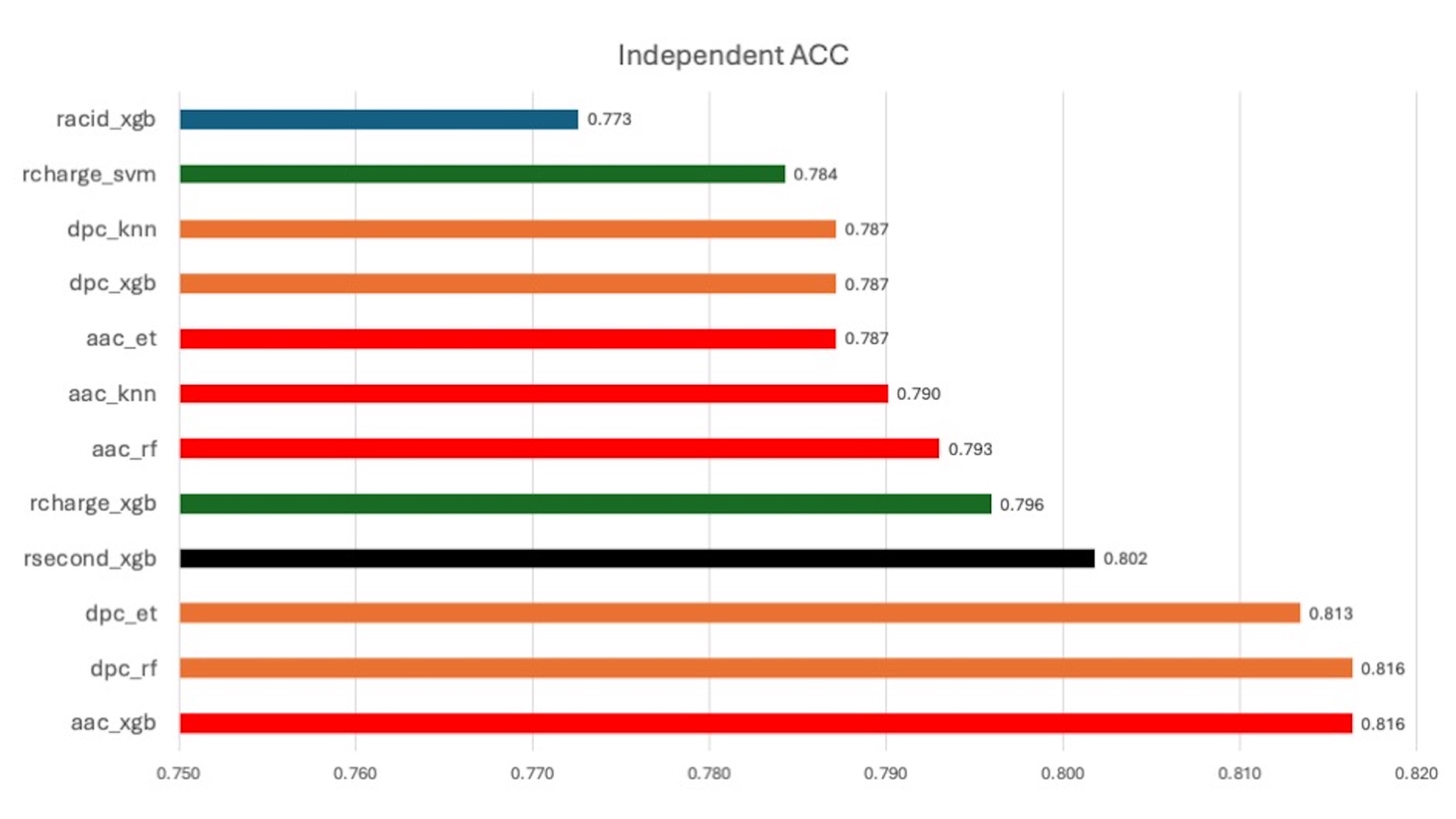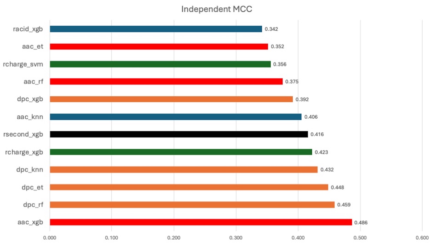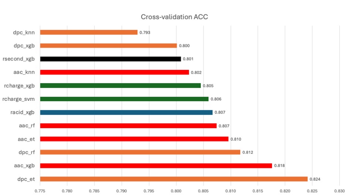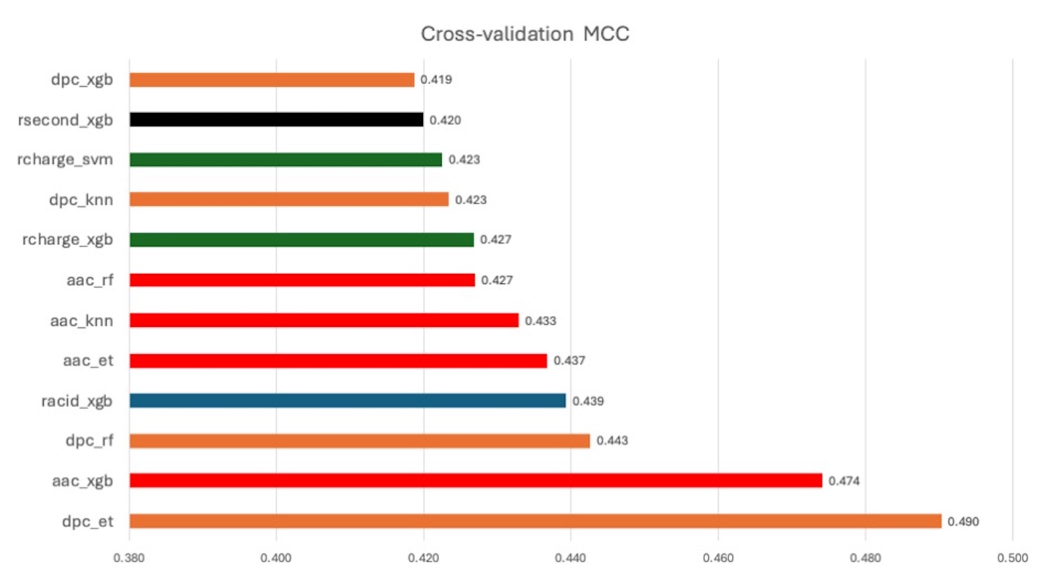 Development and evaluation of a baseline model Following this step, the data to extract features using 12 descriptors were utilized, including aac, pcp, aaindex, apaac, ctd, dpc, paac, racid, rcharge, rdhp, rpolar, and rsecond. Next, a model is constructed using 10 different algorithms, including svm, rf, et, knn, lr, dt, nb, ada, xgb, and nn, resulting in an overall total of 120 baseline models. Afterwards, the model’s performance was evaluated using ACC, recall, precision, MCC, and AUC values in both the cross-validation set and the independent testing set. These values, together with the corresponding parameters, are presented in Tables 2 and 3. When considering the 120 baseline values shown in Figures 4 and 5, which show the ACC values of CV and IN sets that are in the top 12, it is found that the dpc_et model in CV set has the highest value of 0.824, followed by aac_xgb, dpc_rf and aac_et, which have values of 0.818, 0.812, and 0.810, respectively, are shown in Figure 4. Figure 5 displays the evaluation of ACC performance for the top 12 baseline models using an IN set. It indicates that the aac_xgb model and dpc_rf model have the highest ACC value, which is 0.816. Following them are the dpc_et model and rcharge_xgb model, with ACC values of 0.813 and 0.802, respectively. The Matthews’ correlation coefficient is a statistic used to assess the performance of classification models. This is especially accurate when the data class is imbalanced [34]. Figures 6 and 7 represent the numerical values of the initial 12 nodes in the baseline model. Figure 6 presents an informative summary of the CV set. The dpc_et model has the highest value of 0.490, followed by the aac_xgb, dpc_rf, and racid_xgb models, with values of 0.474, 0.443, and 0.439, respectively. Figure 7 shows the Matthews Correlation Coefficient (MCC) values for the 12 highest-ranking models in the IN set. The aac_xgb model has the greatest value, with a value of 0.486. It is followed by dpc_rf, dpc_et, and dpc_knn, which have values of 0.459, 0.448, and 0.432, respectively.