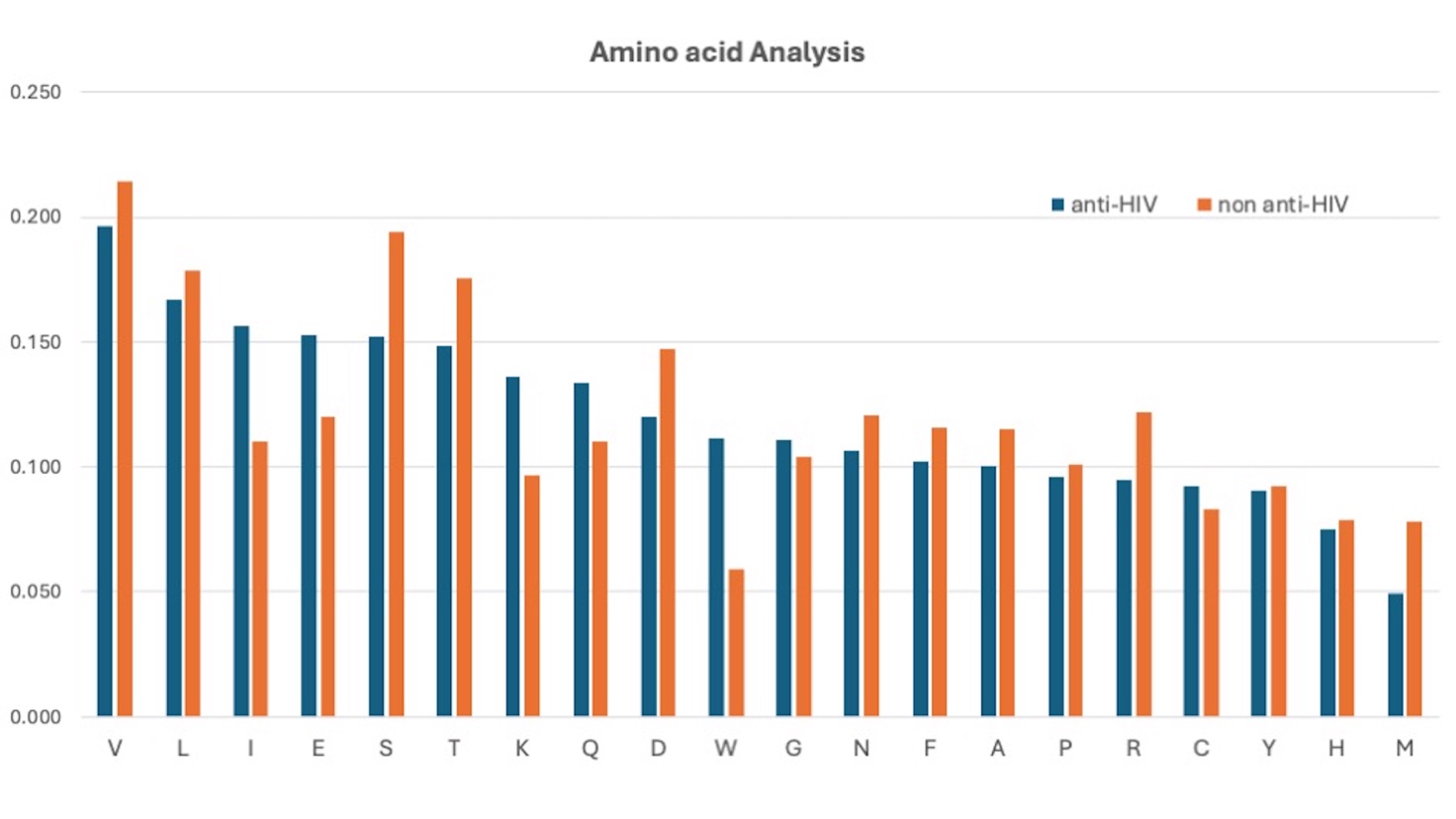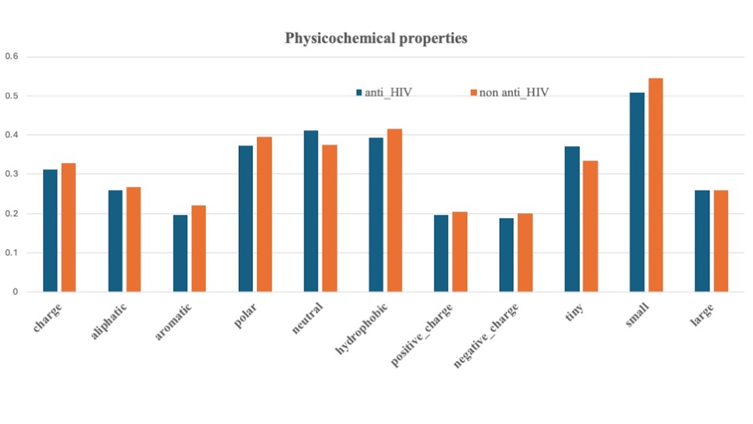 Figure 3 Comparative distribution of physicochemical features based on amino acid content of anti-HIV peptides and non-anti-HIV peptides. The graph depicts discrepancies in amino acid counts that could lead to functional differentiation between the 2 datasets.