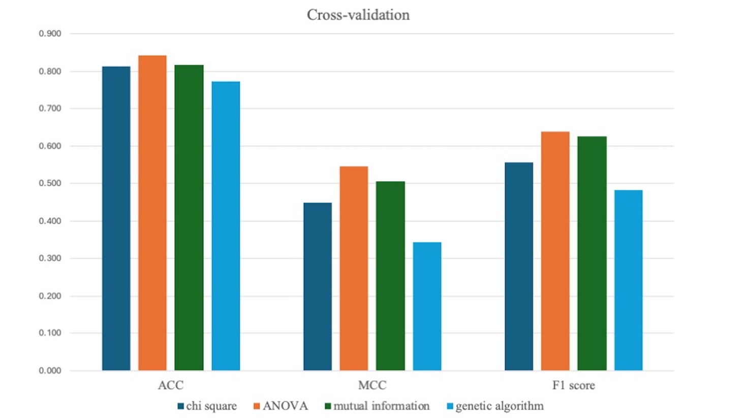 Figure 10 Model performance was compared using 4 feature selection methods - Chi-square, ANOVA, Mutual Information, and Genetic Algorithm - on a cross-validation dataset. Genetic Algorithm-selected models earned the highest prediction accuracy and F1-score, demonstrating their usefulness in feature optimization for this dataset.