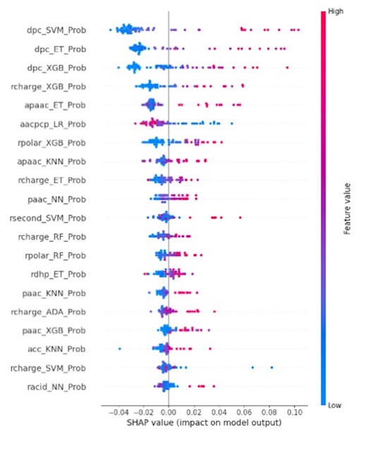 Following this step, the impact of features are examined, which are the predictive probability values derived from a model constructed using 12 descriptors and 10 classifiers. Then utilize the genetic algorithm of the GAXGB model to choose the most suitable features. The SHAP value analytical findings are shown in Figure 12. There will be a total of 10 ranks. The initial significant characteristics include dpc_XGB, rcharge_XGB, apaac_ET, rcharge_RF, dpc_LR, paac_ET, paac_KNN, paac_SVM, rcharge_ET, and rsecond_XGB. Most of the red dots represent high-value attributes in the right pane. It demonstrates the impact on the model’s forecast.