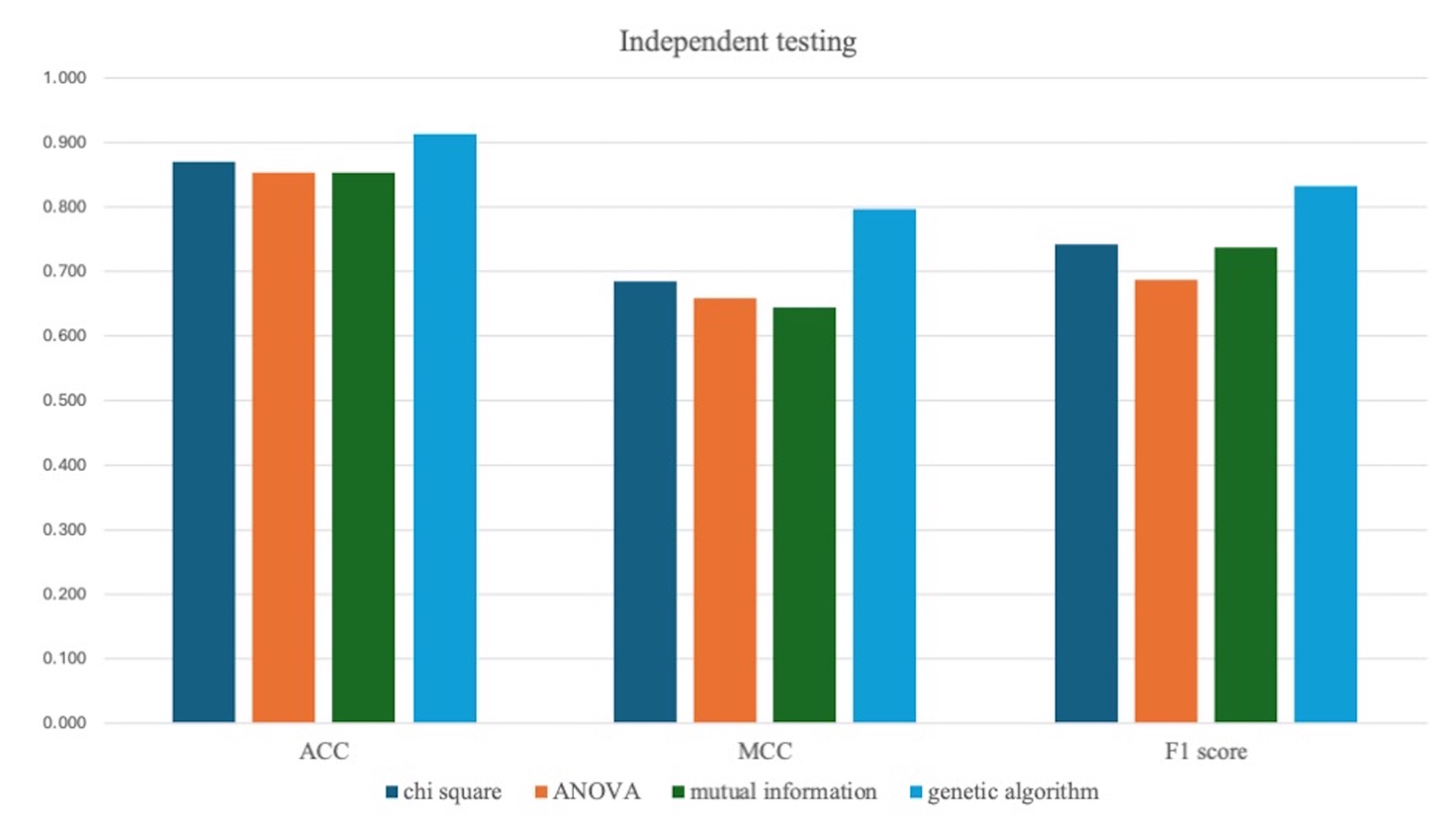 Whenever the 120 baseline, models have been established, use this data to generate new data by computing the predictive probability based on the baseline model. The process of data engineering will generate new features based on the 120 baseline models. Next, apply the newly gathered data to build the model. The model was constructed using 10 classifiers and subsequently evaluated for its performance using an independent dataset. The Naive Bayes model achieved the highest rating score. Engineering data is using predictive probability values to construct models for classifying peptides based on their varied properties [40-42]. The building of the GAXGB model includes both data engineering and applying of 4 feature selection methods: Chi square, ANOVA, mutual information, and genetic algorithm. The genetic algorithm method generates the greatest assessment values for ACC, MCC, and F1-score in the independent testing set, showing higher efficiency. The use of the Chi-Square test and reduced redundancy for selecting features in machine learning models [43]. This method is used frequently to determine the correlation between categorical variables and their target labels. It has the advantage of simplifying data complexity while preserving significant features [43,44]. Similarly, in situations of datasets with a significant number of dimensions, ANOVA (Analysis of Variance) and Mutual Information methods are commonly used for selecting features. These techniques evaluate the significance and duplication of features, which is important in determining the most influential variables for a classification problem [43]. Genetic Algorithms (GA) use operations such as selection, crossover, and mutation to progressively enhance the quality of solutions. This leads to improved efficiency in measures like ACC (accuracy), MCC (Matthews correlation coefficient), and F1-score during model assessments [45,46]. Furthermore, the ability of GA to maintain a dynamic equilibrium between exploration (seeking new areas in the solution space) and exploitation (improving current solutions) is what enables them to generate improved assessment values [47]. While genetic algorithms (GA) are an effective technique for feature selection and model improvement, they have some drawbacks, including runtime, which varies based on population size, number of generations, and the complexity of fitness evaluation. In practice, using GA may necessitate sufficient hardware resources (e.g., multi-core CPUs or GPUs) and careful parameter optimization to ensure scalability when applied to huge datasets. (No. 1)