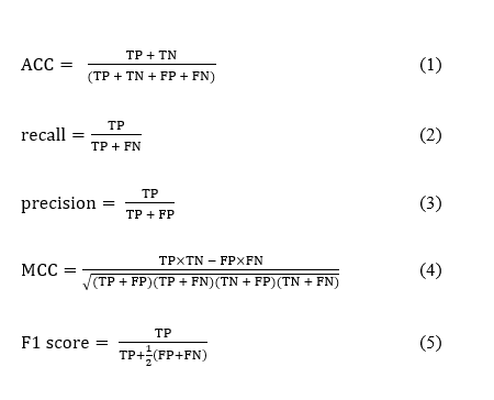 Model performance evaluation The model’s performance value indicates its abilities in several areas. The developed model in this study tested the following performance values: accuracy (ACC), recall, precision, and Matthews’ correlation coefficient (MCC). The formula can calculate the measurements. As follows: