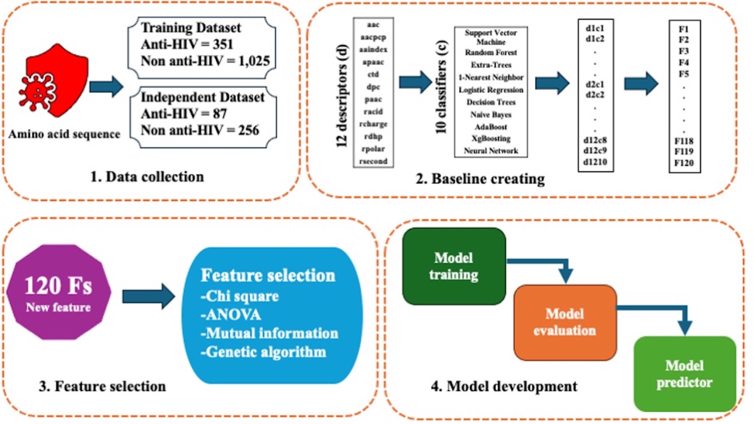 Figure 1 represents the progress of the GAXGB model development study. It was widely divided into 4 steps: Data collection, baseline creation, feature selection, and model development, as described below: The first step was to group together the data used in this study into amino acid sequences totaling 1,719 peptides collected from an online database. The second step is the feature calculation process, extracting features from 12 descriptors and then valuing the predictive probabilities score with 10 classifiers to create 120 NF of new features. The third step is determining the appropriate features to build a model for classifying anti-HIV peptides using 4 methods: Chi square, ANOVA, mutual information, and genetic algorithm. And the last step involves developing the model by constructing and evaluating its performance to achieve the aim of the GAXGB model.