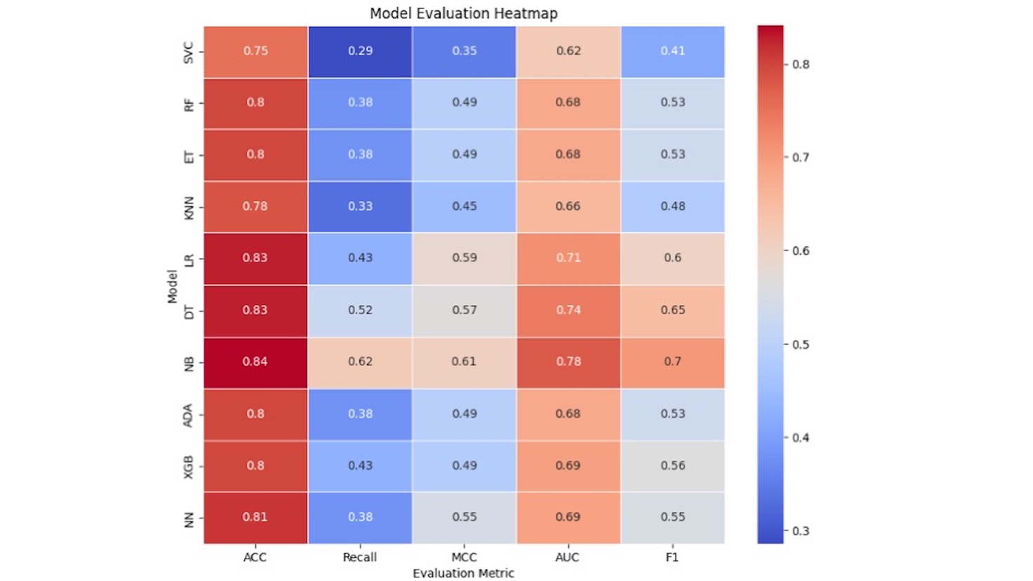 Figure 6 Matthews Correlation Coefficient (MCC) performance estimates for the top 12 baseline machine learning models were calculated using 10-fold cross-validation on the training dataset. Each bar shows the average MCC across folds. Higher MCC values indicate improved overall classification performance, which balances sensitivity and specificity.