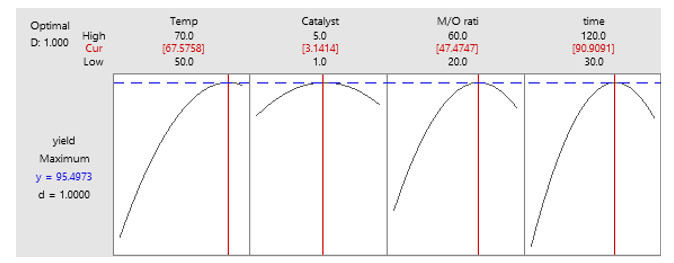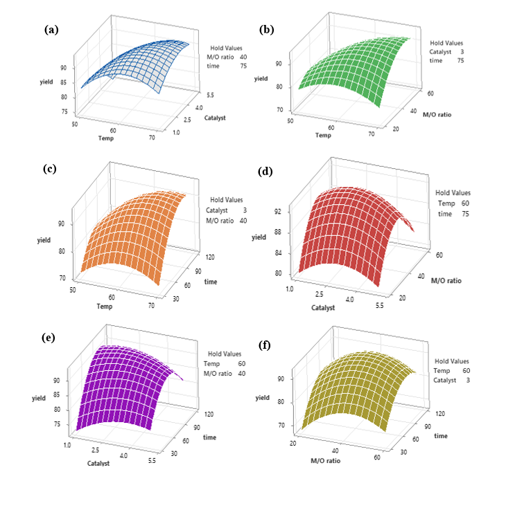 In the DOE, the factors use including alcohol, catalyst concentration, reaction time, and temperature. These factors are crucial to maximizing biodiesel yield from the transesterification process [33] . Consequently, the studies were executed utilizing a DOE in Minitab-21 statistical software, as illustrated in Table 1 .