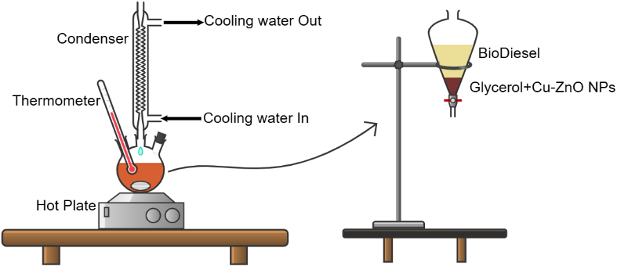 Before transesterification process the waste cooking oil was filtrated through a cloth to remove the food residuals and then subject to heat at 120 °C, 2 h for removal of the moisture content, the treated oil was reacted with methanol in the present of Cu-ZnO as a catalyst. For each experiment, 20 g of pre-treated WCO were put into a 250 mL 3-nick round bottom flask connected with reflex condenser as shown in ( Figure 2 ). Subsequently, a weight percentage of Cu-ZnO NPs catalyst ranging from 1% to 5% and methanol in a weight percentage ratio of 20 to 60 were incorporated into the oil. The reaction mixture was heated to a temperature range of 50 to 70 °C while being stirred at 600 r/min. The reaction mixture was subjected to reflux for a duration of 30 to 120 min. Ultimately the mixture was subsequently transferred to a 250-mL separation funnel and allowed to stand for 12 - 24 h to achieve the distinct layers of biodiesel, glycerol, and catalyst [31] .