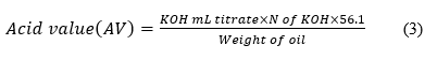 For the saponification value, 2 g of oil was measured and mixed with 25 mL of alcoholic KOH and a tiny amount of ethanol (3 mL). A reaction was performed with mixtures maintained at 100 °C for 1 h. Following incubation, they were allowed to cool, treated with phenolphthalein indicator, and then titrated with (0.5 N HCl). The saponification value of the waste oil was calculated using the specified equation [32] .