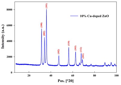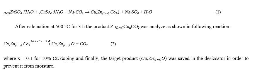 In the precent preparation, the precursors ZnSO 4 ·7H 2 O and CuSO 4 ·5H 2 O were first dissolved in 100 mL of distilled water in a beaker with 0.45 and 0.05 M to achieve 10% Cu-doped ZnO, mixed well on a magnetic hot plate with the magnetic bar, and the temperature was raised to 60 °C. In another beaker, a Na 2 CO 3 solution (0.5 M) was progressively added dropwise under vigorous stirring (500 rpm) until the pH reached 8. Blue-White precipitates formed during 2 h of continuous stirring of the reaction mixture. After resting overnight, the final product was thoroughly washed 3 times using distilled water and ethanol to remove residual impurities and filtered, then placed in a hot air oven set to 80 °C for 2 h. A gemstone mortar was used for crushing the dry precursor into a fine powder. Finally, all hydroxide molecules are thermally decomposed by annealing the powdered products in a muffle furnace at 500 °C for 3 h.