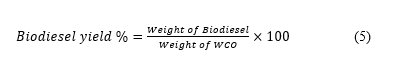 A physicochemical analysis of waste cooking oil was conducted by assessing parameters like acid value, density, and saponification value. The density of waste oil was determined using the mass-to-volume formula. The acid value was determined by mixing 5 g of waste cooking oil with few drops of phenolphthalein indicator in a beaker. The beaker’s contents were titrated with 0.01 N KOH until a pale pink hue appeared. The acid value of the oil was calculated utilizing the subsequent equation [30,31] .
