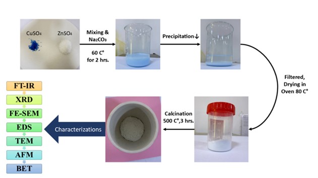 The Cu-ZnO nanoparticles were characterized by using Fourier transform infrared (FT-IR) for functional group identification. The crystal structure was examined by X-ray Diffraction (XRD). The morphological and compositions characteristics of the Cu-doped ZnO nanoparticles were analyzed using field emission scanning electron microscopy (FE-SEM, EDS). Additional characterization of particles by Transmission Electron Microscopy (TEM). Furthermore, the surface topography and roughness of the nanoparticles were examined by Atomic Force Microscopy (AFM) and Brunauer-Emmett-Teller (BET) technique was used for specific surface area and porosity analysis. Figure 1 shows the steps of synthesis of NPs catalysts and catalysts characterization.