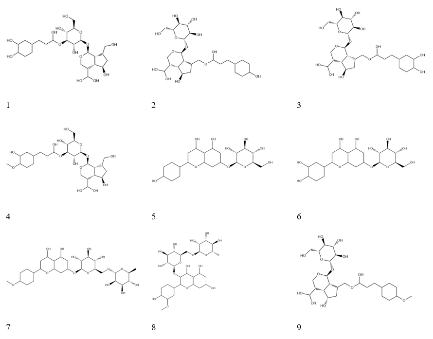 Figure 1 Chemical structures of compound 37 (1), compound 38 (2), compound 39 (3), compound 40 (4), cosmetin (5), cynaroside (6), linarin (7), narcissin (8) and paederinin (9).