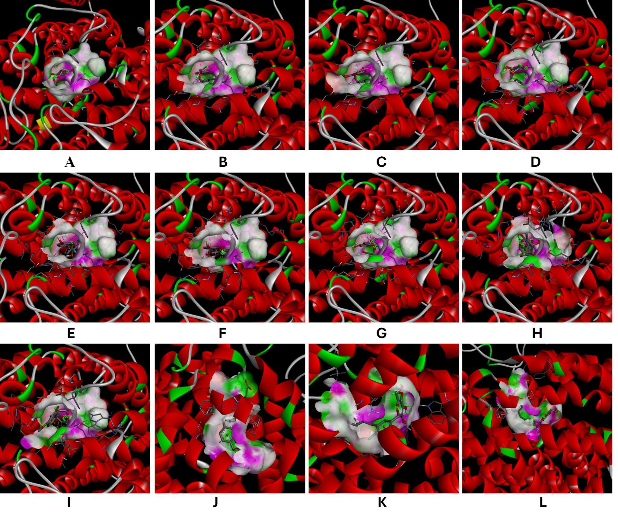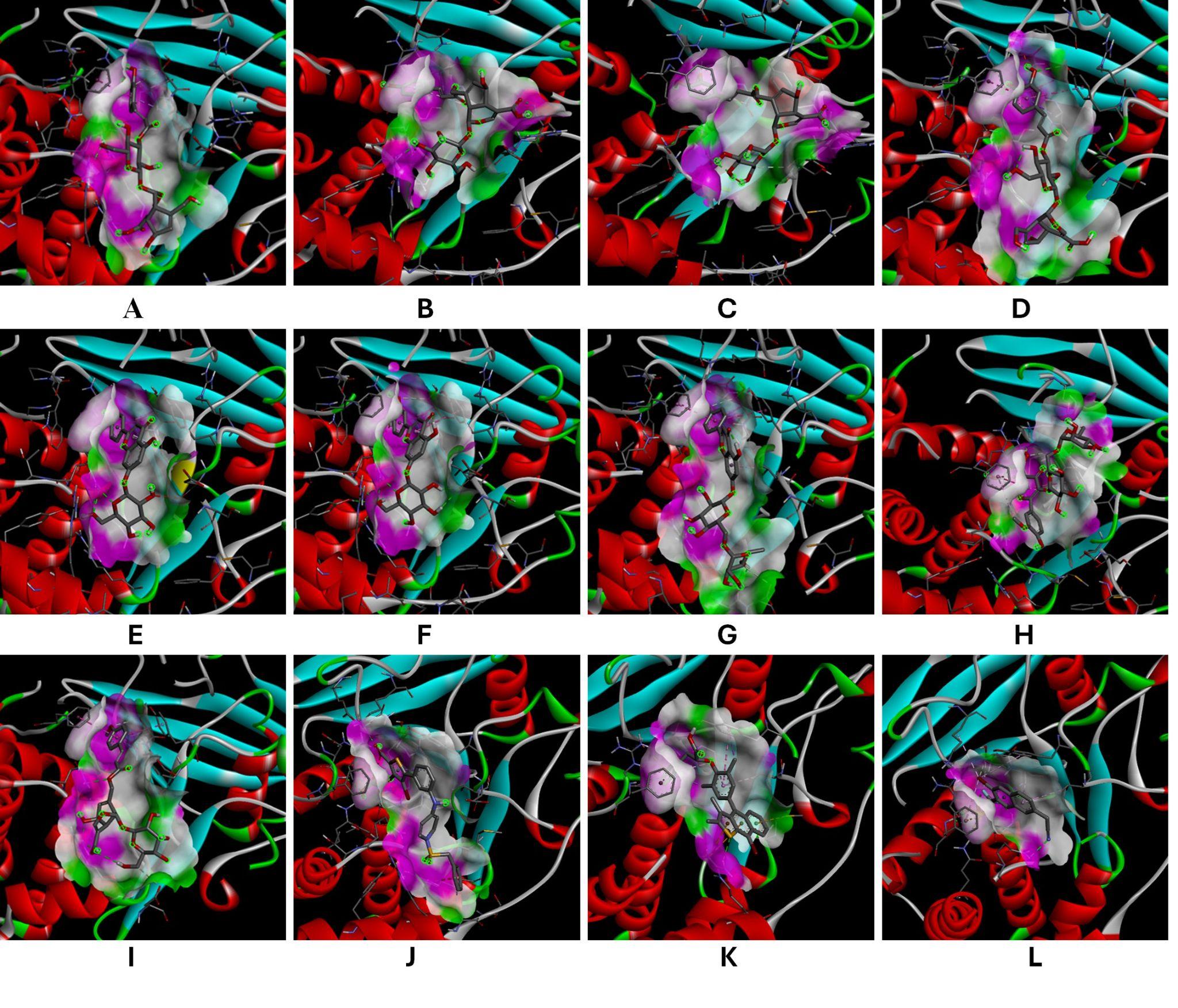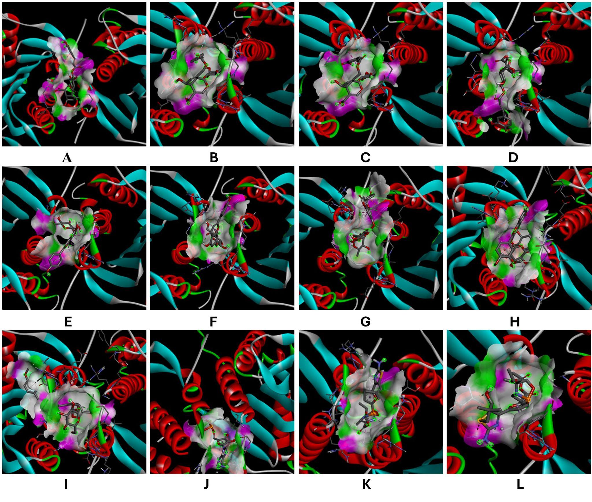 All 80 compounds found in the literature are tested. Following molecular docking, we summarized the molecular docking results and picked nine ligands with the highest average binding energy. These nine compounds were selected because of their great affinity towards all four receptors. The selected compounds then analyzed further. The receptor–ligand complexes were then visualized using Discovery Studio Visualizer to examine the binding interactions and identify the interacting amino acid residues.