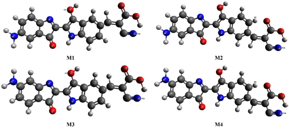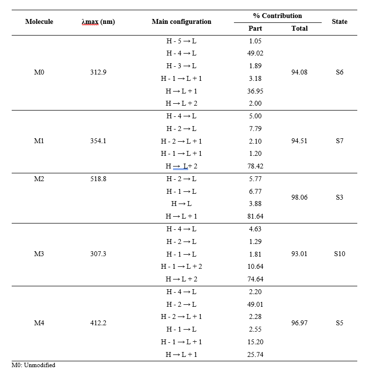 Based on Figure 3 , the highest absorption wavelength of each model exhibits different values. The unmodified indigo molecule shows an absorption wavelength of 312.9 nm with the highest oscillator strength of 0.46. Molecule M1 exhibits an absorption wavelength of 354.1 nm with the highest oscillator strength of 1.35. Molecule M2 shows an absorption wavelength of 518.8 nm with the highest oscillator strength of 0.60. Molecule M3 has an absorption wavelength of 307.3 nm with the highest oscillator strength of 0.99. Molecule M4 exhibits an absorption wavelength of 412.2 nm with the highest oscillator strength of 0.85. In this study, molecules M1, M2, and M4 successfully shifted the absorption towards the visible spectrum. Among them, molecule M2 achieved the largest shift, namely 205.9 nm, compared to the unmodified indigo molecule. Therefore, in terms of shifting towards the visible light spectrum, molecule M2 shows strong potential as a sensitizer for natural indigo molecules. The maximum wavelengths of each model are summarized in Table 3 .