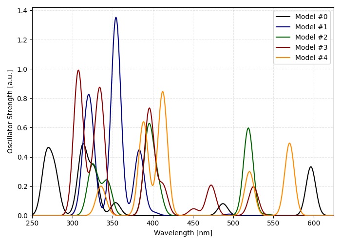 The absorption wavelength calculations were obtained using the time-dependent density functional theory (TDDFT) approach. The absorption wavelength calculations for each model are illustrated in Figure 3 . The different colors in the spectrum indicate different structural models. The figure describes that Model #0 is the unmodified indigo molecule (M0), Model #1 is M1, Model #2 is M2, Model #3 is M3, and Model #4 is M4.