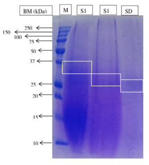 Molecular weight was determined using the SDS-PAGE (Sodium dodecyl sulphate polyacrylamide gel electrophoresis). To achieve this, 0.1 g of protein hydrolysates was dissolved in 1 mL of 0.1 M phosphate buffer pH 7. It should be noted that samples with S1 code are FPHs samples from scales powder that have not been dialyzed, while samples with SD code are FPHs samples from scales powder that have already been dialyzed. The samples were then analyzed by SDS-PAGE using a 15% separating gel and a 4% stacking gel. The SDS-PAGE results are shown in Figure 4.