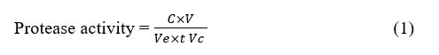 A set of steps was carried out to assess the protease activity of the papain [11]. Initially, 0.2 mL of the 1:1 diluted supernatant obtained from the crude papain extract was mixed with 0.5 mL of a 1% (w/v) casein substrate solution in a pH 7 phosphate buffer. The mixture was incubated at 37 °C for 20 min. One mL of a trichloroacetic acid (TCA) 10% was added to stop the reaction. The solution was then allowed to sit for 15 min at room temperature. Next, the solution was centrifuged at 10,000 rpm and a temperature of 4 °C for 10 min, separating the supernatant. Next, 2.5 mL of a Na2CO3 solution with a concentration of 0.4 M and 1 mL of Folin-Ciocalteu reagent in a 1:1 ratio was added to the supernatant. The mixture was homogenized, followed by an incubation period of 30 min in a dark room at room temperature. Subsequently, the solution’s absorbance was measured at a wavelength of λ = 660 nm to evaluate the protease activity of the crude extract of papain by utilizing Eq. (1).