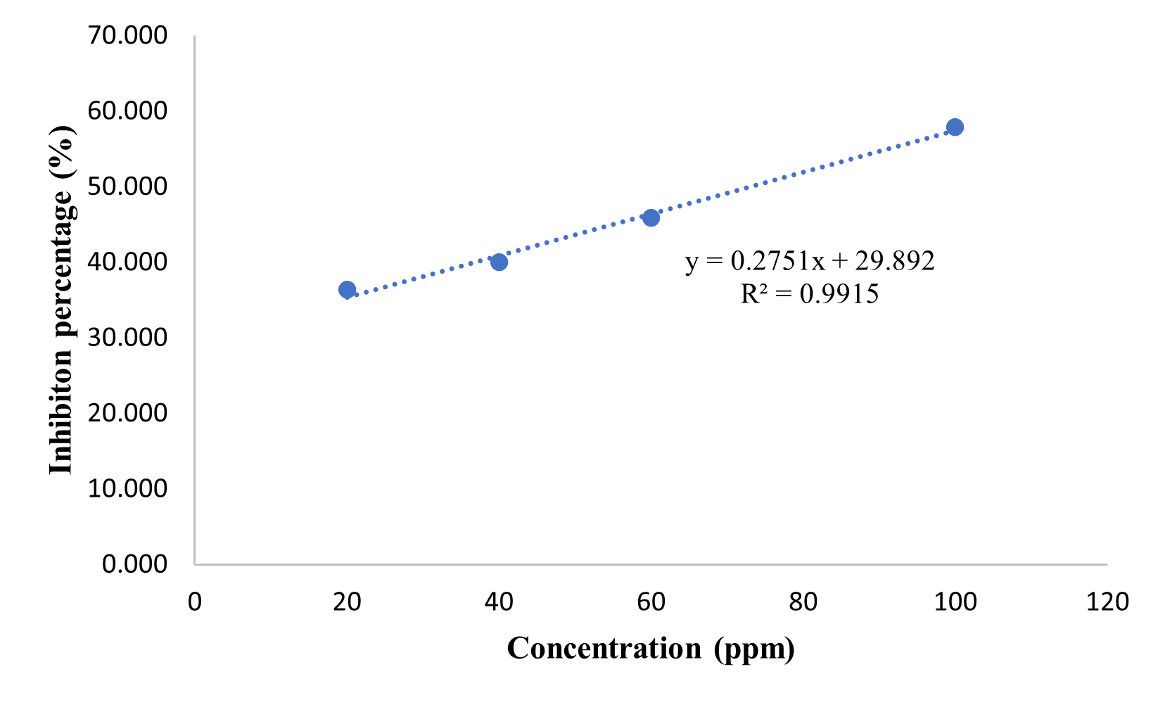 The antioxidant activity test was conducted in this study using the DPPH method. This method is known as a valid, accurate, simple, and economical technique for assessing the ability of a compound to act as a free radical scavenger or hydrogen donor. In addition, this method can be applied to measure antioxidant activity in complex biological systems, both in solid and liquid samples [29]. The yielded results in the form of percentage inhibition and IC50 value. A smaller IC50 value indicates higher antioxidant activity [30]. Results are shown in Figure 6.