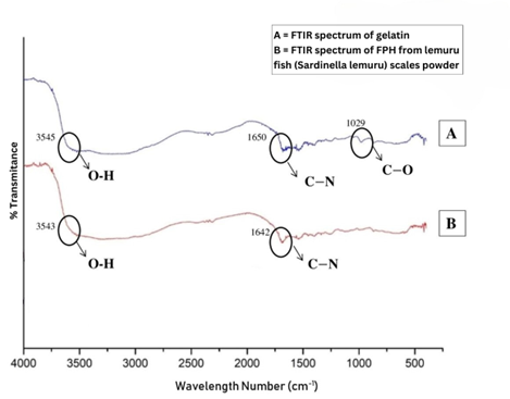 The protein hydrolysates derived from lemuru scales powder displays functional group traits similar to gelatin. Gelatin possesses carbonyl, amine, and hydroxyl functional groups, which are important in the protein structure. Figure 3 displays the FTIR results of protein hydrolysates obtained from lemuru scales powder (B) compared to the FTIR of gelatin (A). As illustrated in Figure 3, the analyzed sample exhibits spectral absorption at approximately 3543 cm–1. This absorption peak is believed to arise from the presence of N-H stretch bonds from amide groups associated with hydrogen bonds and OH groups [24]. Another absorption peak appears in the spectra at around 1642 cm–1. It is reported that the absorption observed at wave numbers 1656 - 1535 cm–1 is attributed to the double bond strain in the C=O carbonyl group, bending the NH bond, and the CN strain [25].