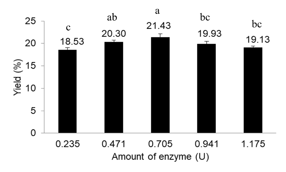 Enzyme concentration also significantly affected yield (F = 13.55; p < 0.001) with an R² of 84.42%. The treatment with 0.705 U enzyme produced the highest yield (21.43 ± 0.72%), significantly higher than 0.235 U (p < 0.05), but not significantly different from 0.471 U. This pattern indicates an optimal enzyme dosage, where initial increases enhance yield, but further addition (≥0.941 U) does not provide additional benefits, possibly due to substrate limitation or product inhibition as shown in Figure 2.