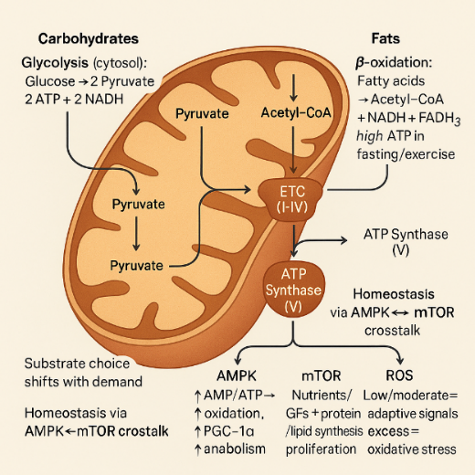 Cellular energy metabolism involves a complex coordination among glycolysis, pyruvate oxidation, the citric acid cycle, and oxidative phosphorylation [10]. Mitochondria play a crucial role in integrating these metabolic pathways to ensure adequate ATP production and maintain redox homeostasis [1]. Moreover, mitochondria act as energy sensors that modulate metabolic activity through various cellular signaling pathways, including the activation of AMP-activated protein kinase (AMPK), the mechanistic target of rapamycin (mTOR), and the generation of reactive oxygen species (ROS) as signaling molecules [11]. These regulatory mechanisms enable cells to adapt to fluctuations in nutrient availability, oxidative stress, and energy demand, thereby promoting physiological adaptation and cellular survival [12].