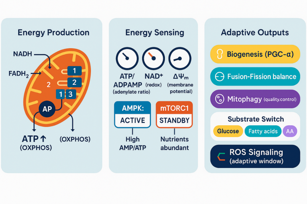 Mitochondria are vital organelles that function as the primary hub of cellular energy metabolism, integrating glycolysis, the Krebs cycle, and oxidative phosphorylation to sustain adenosine triphosphate (ATP) production. Beyond energy generation, mitochondria act as dynamic regulators of cellular homeostasis through processes such as fusion, fission, biogenesis, and mitophagy, as well as through redox and oxidative stress signaling. These mechanisms enable cells to adapt to fluctuations in nutrient availability, oxygen concentration, and energy demand, thereby maintaining metabolic flexibility and functional integrity across tissues, including muscle, liver, and brain. Mitochondrial dysfunction disrupts oxidative phosphorylation, promotes reactive oxygen species (ROS) accumulation, and reduces respiratory capacity, leading to metabolic, cardiovascular, and neurodegenerative disorders. Recent advances have revealed the critical regulatory roles of AMP-activated protein kinase (AMPK), mechanistic target of rapamycin (mTOR), and peroxisome proliferator-activated receptor gamma coactivator 1-alpha (PGC-1α) in controlling mitochondrial biogenesis, respiration, and stress responses. Additionally, the interactions between mitochondria and other cellular organelles are essential for maintaining energy balance and adapting to cellular stress. Technological innovations, including metabolomics, proteomics, and super-resolution microscopy, have enhanced our ability to study mitochondrial function at the molecular and tissue levels with unprecedented precision. Future research focusing on mitochondrial adaptation mechanisms and inter-organelle communication will provide a foundation for developing mitochondria-targeted therapeutic strategies aimed at improving energy efficiency, strengthening cellular resilience, and preventing degenerative disease progression.