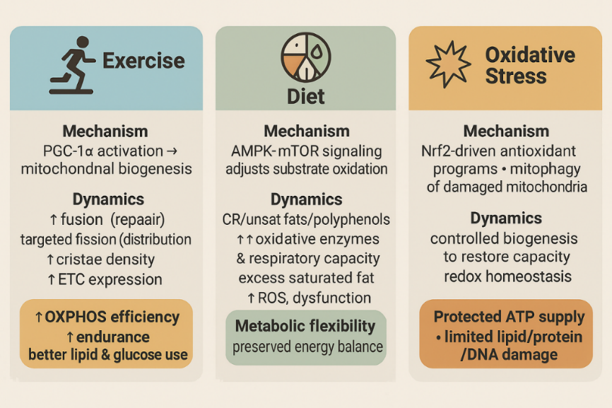 From a systemic perspective, mitochondria are not only vital at the cellular level but also exert a profound influence on organ and tissue function [1]. In skeletal muscle, mitochondrial capacity determines endurance and contractile performance [13]. In the liver, mitochondria regulate glucose and lipid metabolism, thereby contributing to whole-body energy homeostasis [14]. In the nervous system, mitochondria fulfill the high-energy requirements of neurons necessary for synaptic transmission and the maintenance of cellular integrity [15]. Mitochondrial dysfunction within these tissues can lead to a wide range of clinical manifestations, including metabolic syndromes, cardiovascular diseases, and age-associated cognitive decline [16].