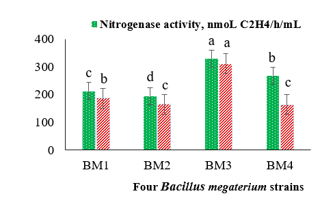 The nitrogenase activity was assessed using the acetylene reduction assay. Four selected and identified strains were grown in YMA liquid medium and incubated for 24 h. The resulting suspension was then used to inoculate a nitrogen-free liquid medium. A control sample was prepared using the N-free liquid medium without the addition of 4 selected Bacillus megaterium strains. The cell density of the selected Bacillus megaterium suspension, determined using spectrophotometry at a wavelength of 600 nm, reached 0.8 under incubation conditions of 30 °C and 160 rpm [34].