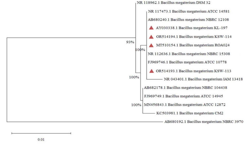 The 10 selected colonies were identified with their 16S rRNA genes by sequencing. Gene amplification was carried out using the universal primers 27F (5'-AGAGTTTGATCCTGGCTCAG-3') and 1492R (5'-GGTTACCTTGTTACGACTT-3') [26,27]. The obtained sequences were compared to the GenBank database using BLAST, and multiple sequence alignment was performed using alignment software (https://www.ncbi.nlm.nih.gov/). The evolutionary relationships were determined based on the method outlined by Saitou and Nei [28], and Tamura et al . [29], with a bootstrap tree generated from 1000 replicates (Felsenstein, 1985). All ambiguous sites were excluded using the pairwise deletion option, phylogenetic and molecular evolutionary analyses were carried out with MEGA 11 [30]. The sequence data for the 4 strains consisted of Bacillus megaterium KL-197, Bacillus megaterium KSW-114, Bacillus megaterium ROA024 and Bacillus megaterium KSW-113, which were thoroughly compared with reference sequences in GenBank via BLAST, and given that the identification thresholds were 100%, these sequences were subsequently submitted to the NCBI GenBank database ( Figure 1 ).