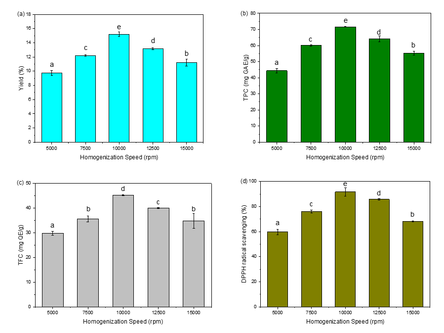 Similarly, the total flavonoid content (TFC) exhibited a strong dependence on solvent concentration and homogenization speed, as depicted in Figure 5(c). The highest TFC (45.1297 mg QE/g) was achieved under the same optimized conditions. Adequate solvent concentration allowed for efficient solubilization of flavonoids, while the appropriate homogenization speed ensured effective disruption of the plant cell walls, thereby releasing the flavonoids into the solvent. However, excessive homogenization speeds may lead to the degradation of sensitive bioactive compounds, resulting in a decrease in TFC. These results underscore the importance of homogenization speed in influencing extraction efficiency, as higher shear promotes matrix breakdown and enhances the release of bioactive compounds.