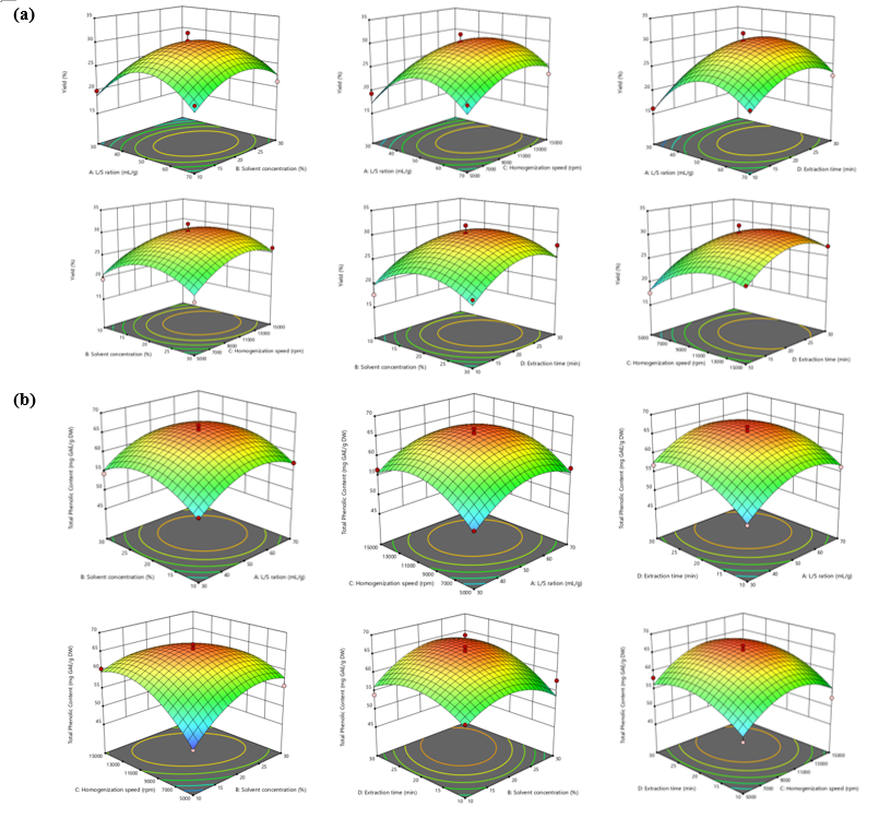 The response surface plots and contour maps for yield (Figure 5(a)) indicated a significant dependency on the liquid-to-solid ratio, solvent concentration, homogenization speed, and extraction time. Under the optimized conditions of 50 mL/g liquid-to-solid ratio, 20% solvent concentration, 10,000 rpm homogenization speed, and 20 min of extraction time, the highest yield (31.7897%) was obtained. These results underscore the importance of maintaining an optimal balance between solvent volume and the surface area of solid material to maximize mass transfer efficiency. Notably, when either the liquid-to-solid ratio or solvent concentration was reduced, a significant decline in yield was observed, highlighting the essential role of solvent availability in the extraction process. This trend aligns with established observations that sufficient solvent volume facilitates effective extraction, enabling more complete solubilization of bioactive compounds.