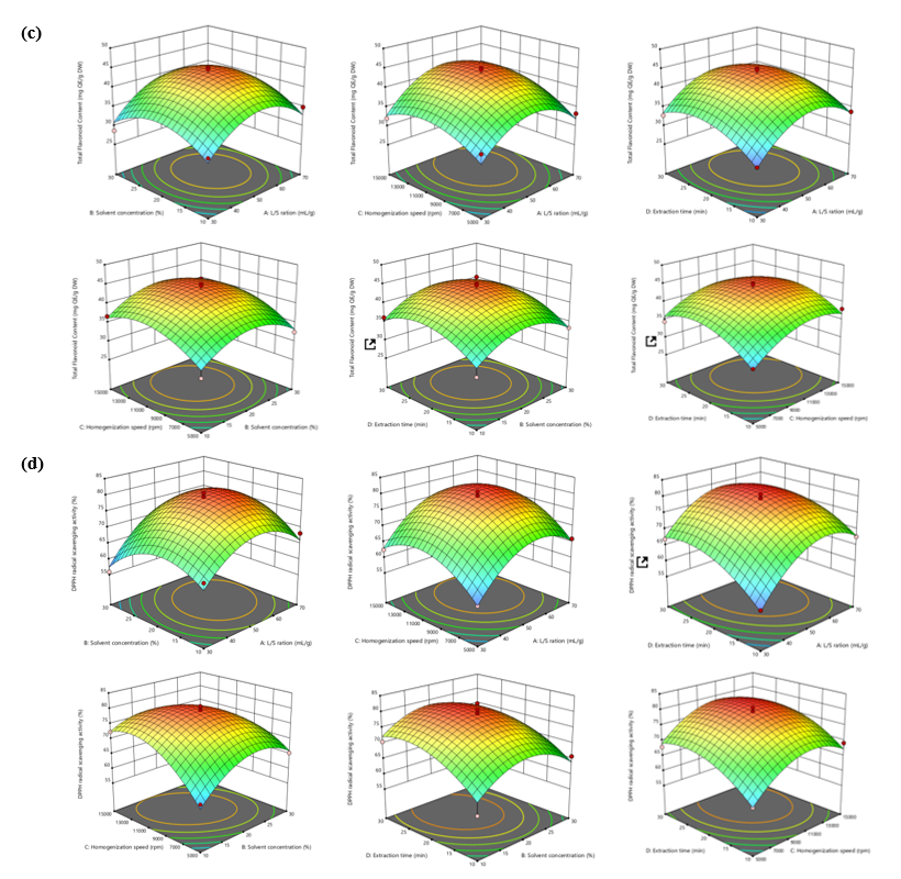 Figure 5 3D response surface methodology (RSM) plots for formulation optimization where the effects of variables on (a) yield, (b) total phenolic content, (c) total flavonoid content and (d) DPPH radical scavenging activity. The assumptions of normality and homogeneity of variance were confirmed prior to ANOVA.