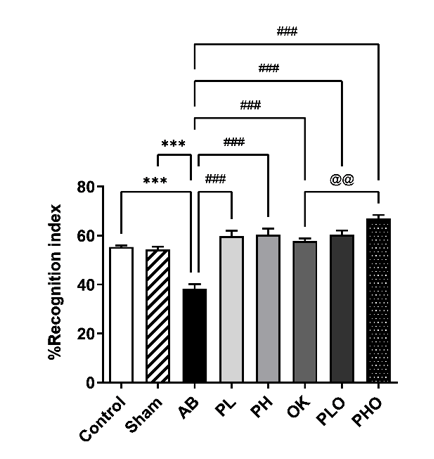 Figure 3 Effects of probiotics and okra on recognition memory. AB, amyloid beta; PL, low-concentration probiotics; PH, high-concentration probiotics; OK, okra; PLO, low-concentration probiotics with okra; and PHO, high-concentration probiotics with okra. Data were expressed as mean ± SEM (n = 7). ***p < 0.001 when compared to the control and sham groups, ###p < 0.001 when compared to the AB group, and @@p < 0.01 when compared to the OK group.