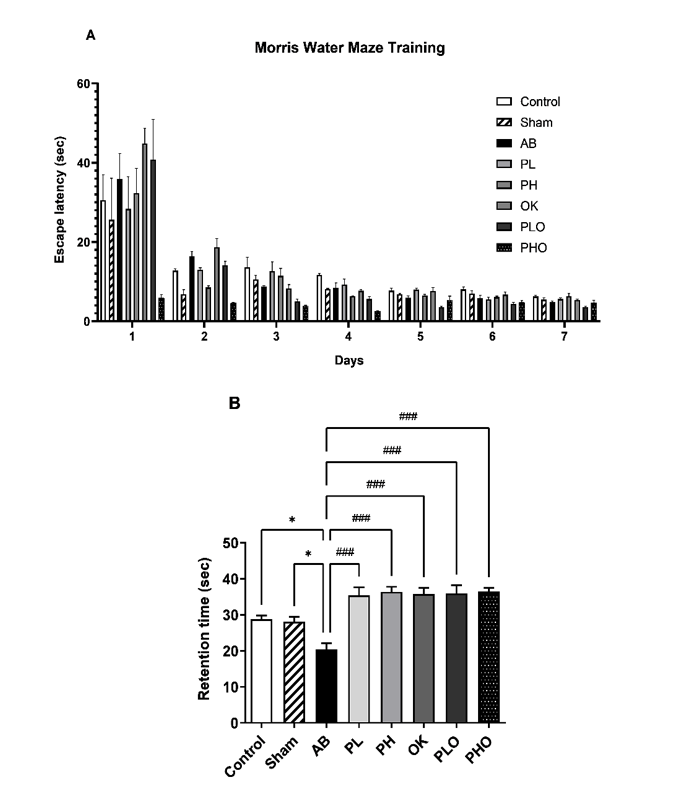 Figure 2 Effects of probiotics and okra on spatial memory: The escape latencies in a training session (A) and the retention time in a testing session (B). AB, amyloid beta; PL, low-concentration probiotics; PH, high-concentration probiotics; OK, okra; PLO, low-concentration probiotics with okra; and PHO, high-concentration probiotics with okra. Data were expressed as mean ± SEM (n = 7). *p < 0.05 when compared to the control and sham groups and ###p < 0.001 when compared to the AB group.