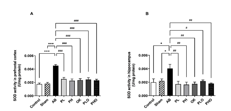 Figure 5 Effects of probiotics and okra on SOD activity in the prefrontal cortex (A) and the hippocampus (B). AB, amyloid beta; PL, low-concentration probiotics; PH, high-concentration probiotics; OK, okra; PLO, low-concentration probiotics with okra; and PHO, high-concentration probiotics with okra. Data were expressed as mean ± SEM (n = 7). *p < 0.05 and ***p < 0.001 when compared to the control and sham groups, #p < 0.05, ##p < 0.01, and ###p < 0.001 when compared to the AB group.