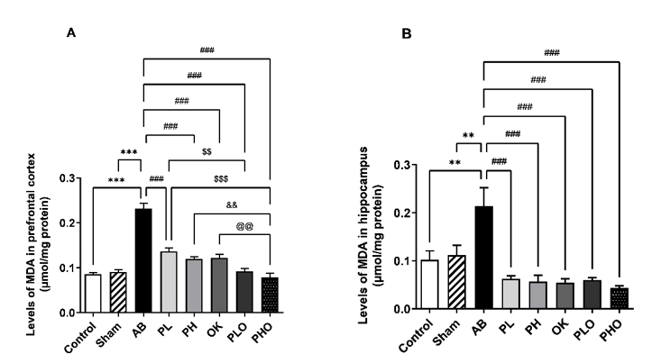 Figure 4 Effects of probiotics and okra on MDA levels in the prefrontal cortex (A) and the hippocampus (B). AB, amyloid beta; PL, low-concentration probiotics; PH, high-concentration probiotics; OK, okra; PLO, low-concentration probiotics with okra; and PHO, high-concentration probiotics with okra. Data were expressed as mean ± SEM (n = 7). **p < 0.01 and ***p < 0.001 when compared to the control and sham groups, ###p < 0.001 when compared to the AB group, $$p < 0.01 and $$$p < 0.001 when compared to the PL group, &&p < 0.01 when compared to the PH group, and @@p < 0.01 when compared to the OK group.