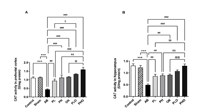 Figure 6 Effects of probiotics and okra on CAT activity in the prefrontal cortex (A) and the hippocampus (B). AB, amyloid beta; PL, low-concentration probiotics; PH, high-concentration probiotics; OK, okra; PLO, low-concentration probiotics with okra; and PHO, high-concentration probiotics with okra. Data were expressed as mean ± SEM (n = 7). ***p < 0.001 when compared to the control and sham groups, ##p < 0.01 and ###p < 0.001 when compared to the AB group, $p < 0.05, $$p < 0.01 and $$$p < 0.001 when compared to the PL group, &&p < 0.01 when compared to the PH group, @p < 0.05 and @@p < 0.01 when compared to the OK group.