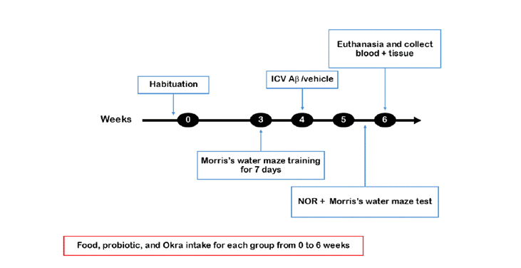 Following a habituation period, rats received oral gavage of probiotics and okra powder for 6 weeks. Locomotor activity testing was conducted after 3 weeks, followed by Morris’s water maze (MWM) training for 7 consecutive days. In the fourth week, Aβ25-35 or PBS was administered via intraventricular injection. Subsequently, MWM testing and novel object recognition (NOR) assessments were performed over a 2-week period after Aβ25-35 injections (Figure 1). At the end of the experiment, the animals were euthanized, and brain samples were collected for molecular analyses.
